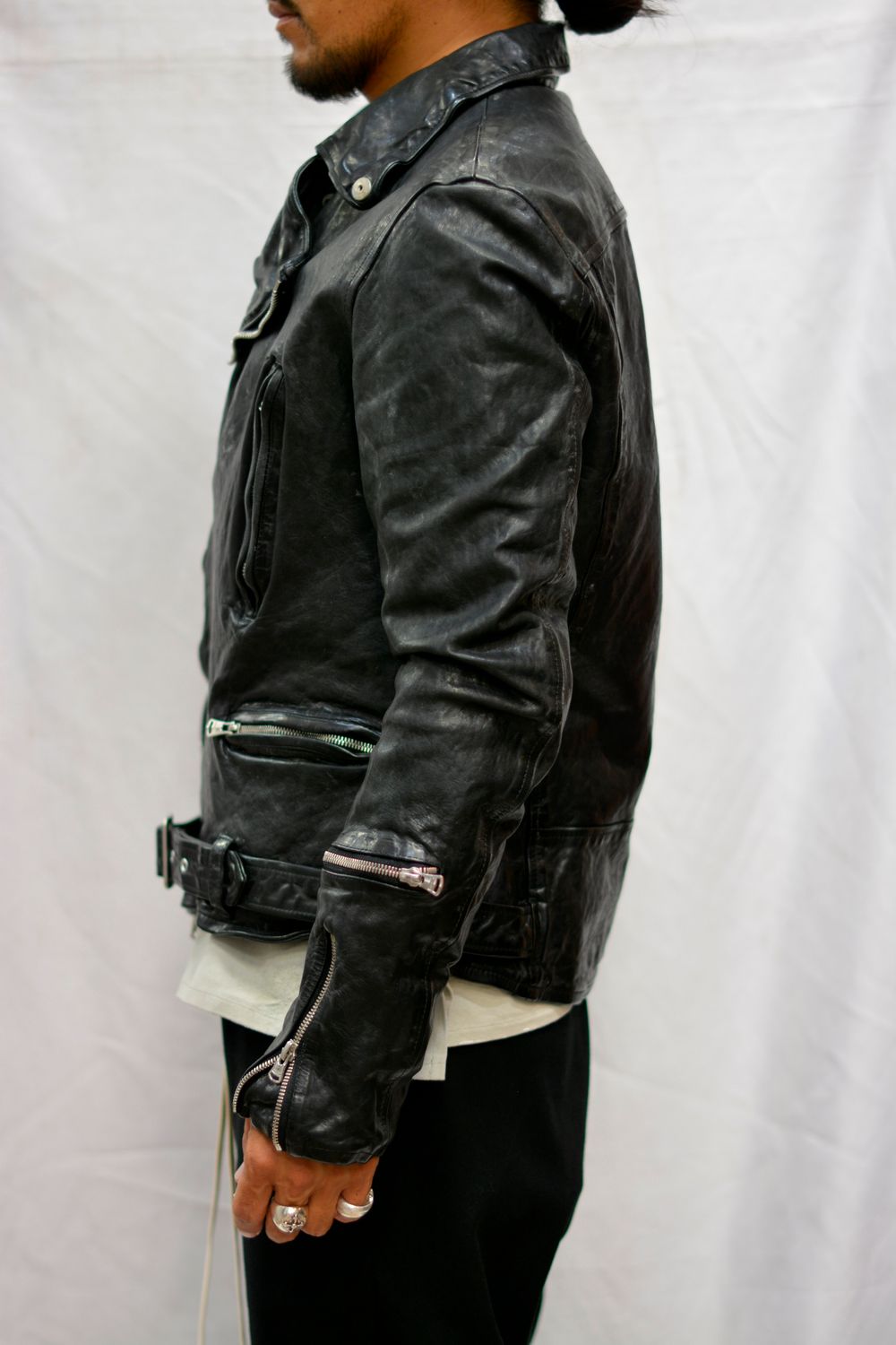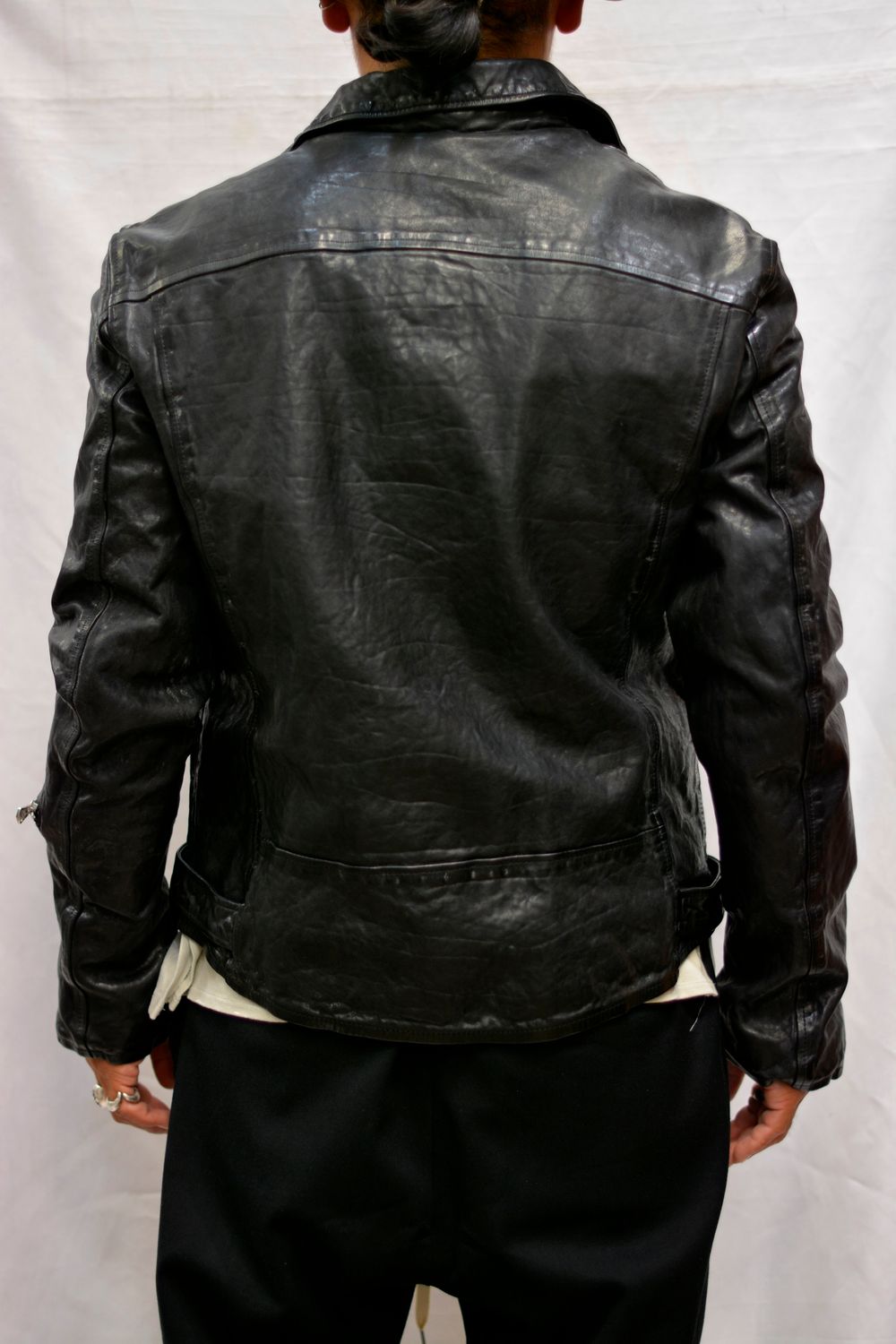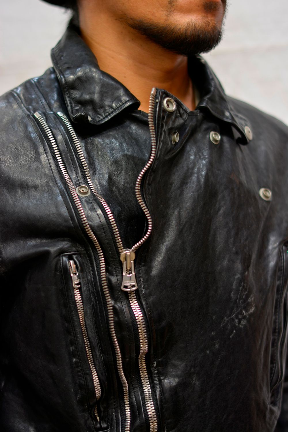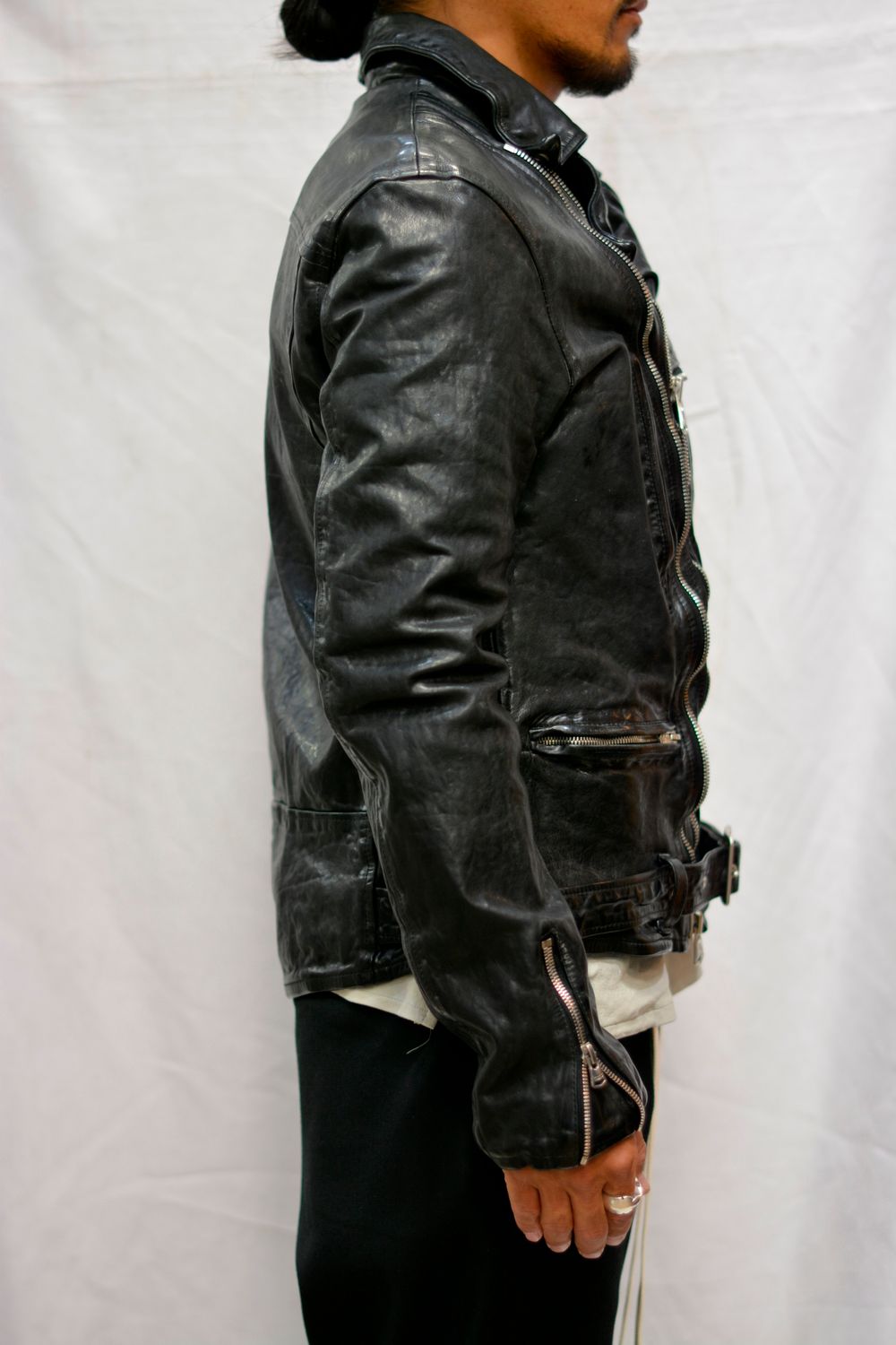 " × THE VIRIDI ANNE フレンチショルダー製品染め ライダース "