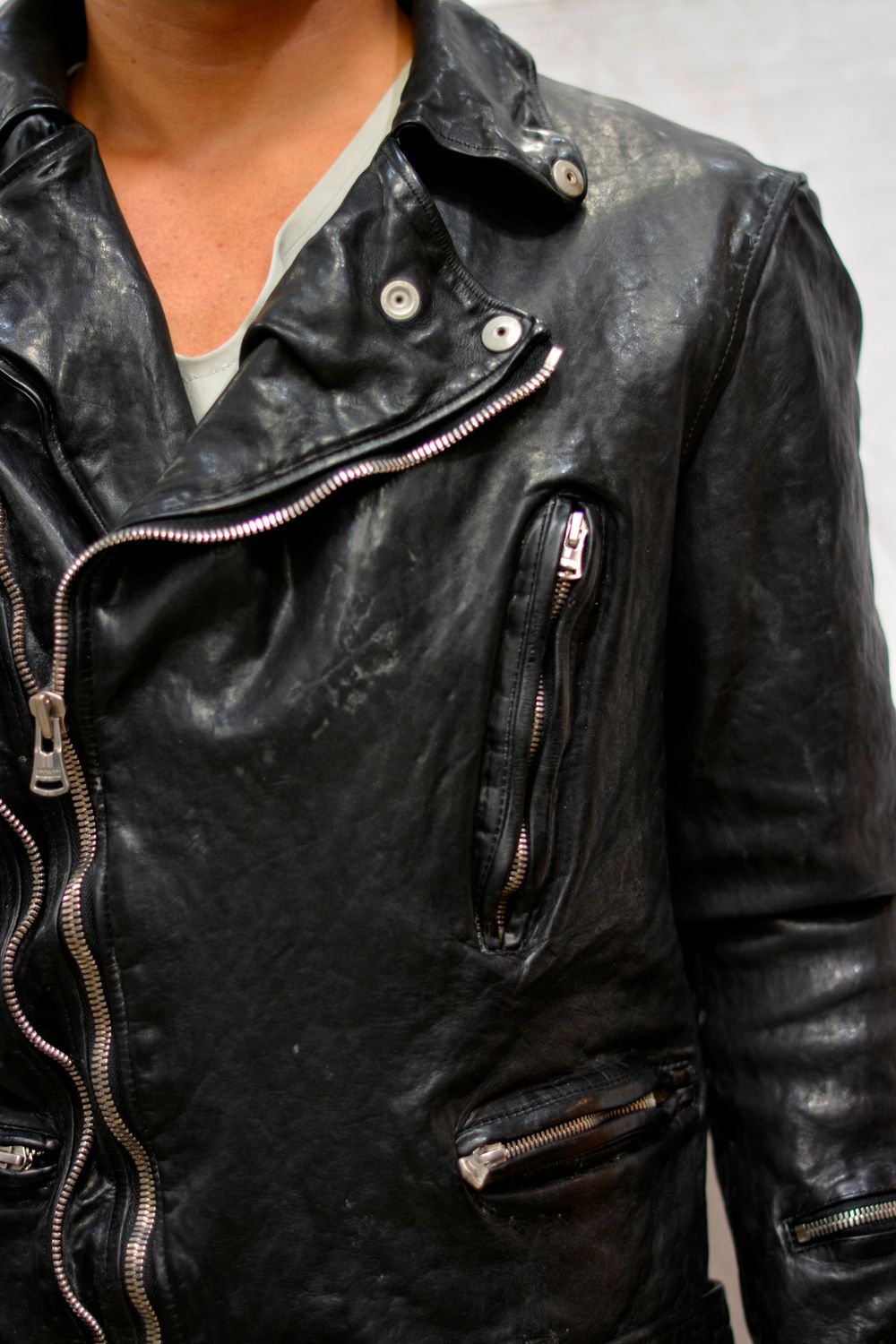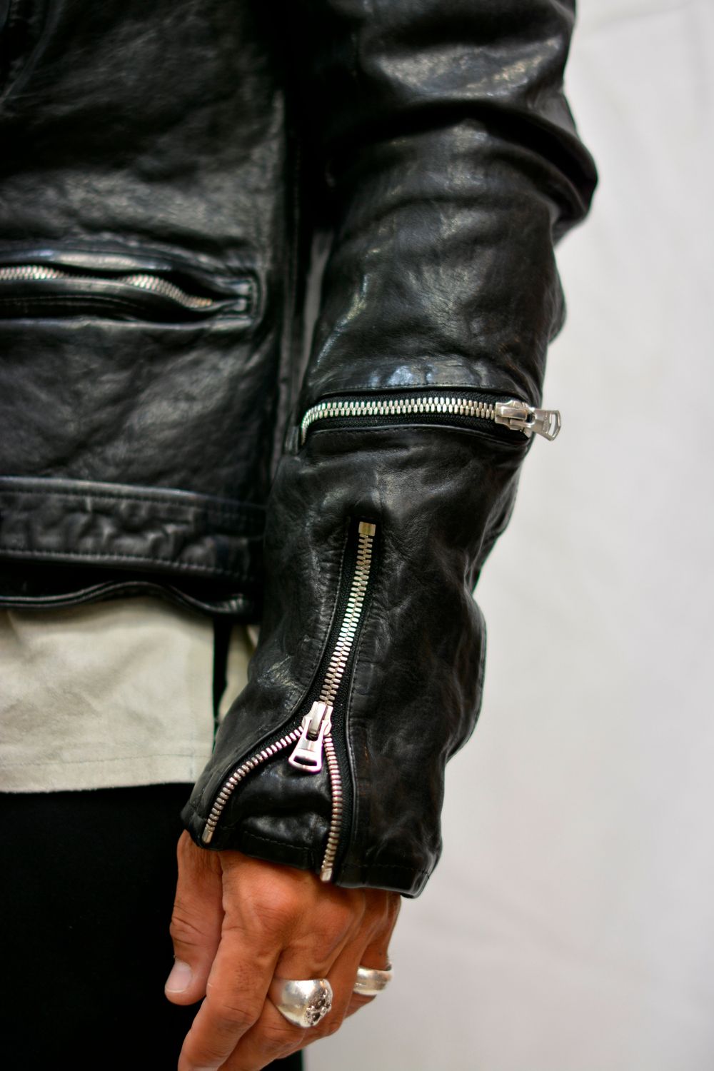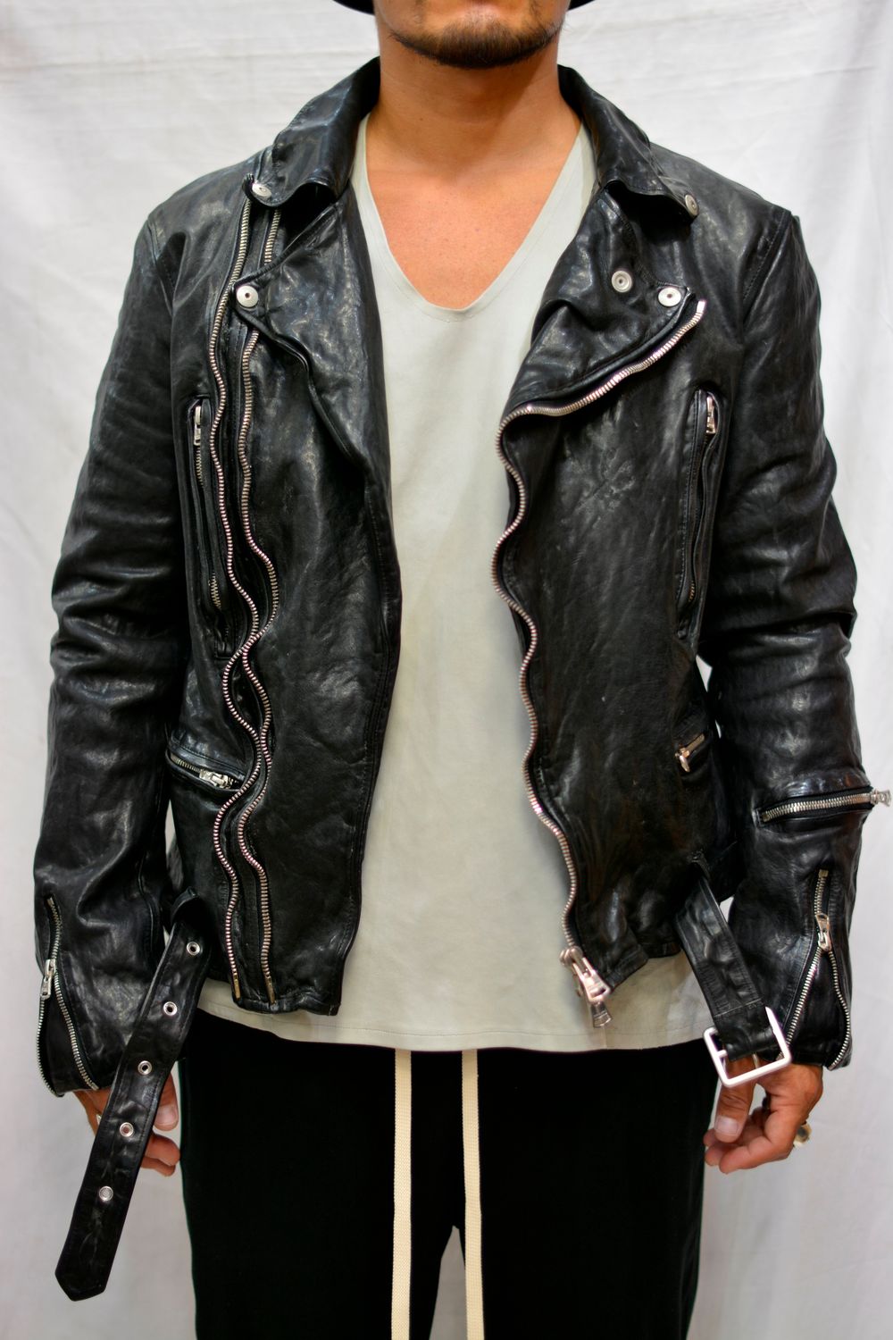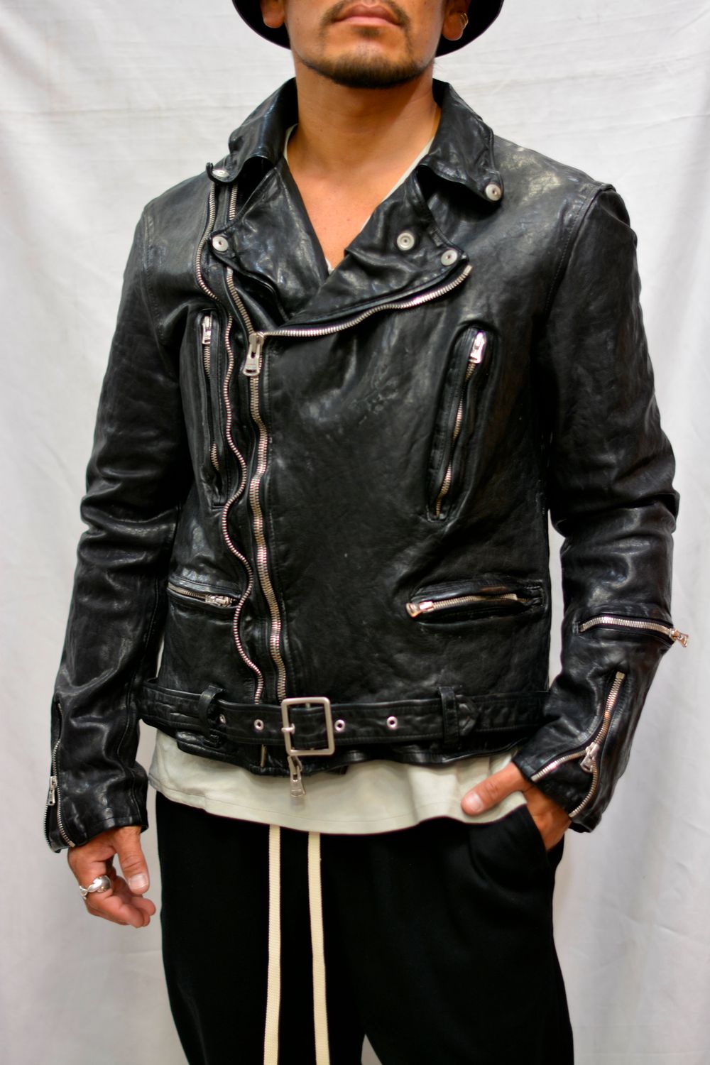 " × THE VIRIDI ANNE フレンチショルダー製品染め ライダース "