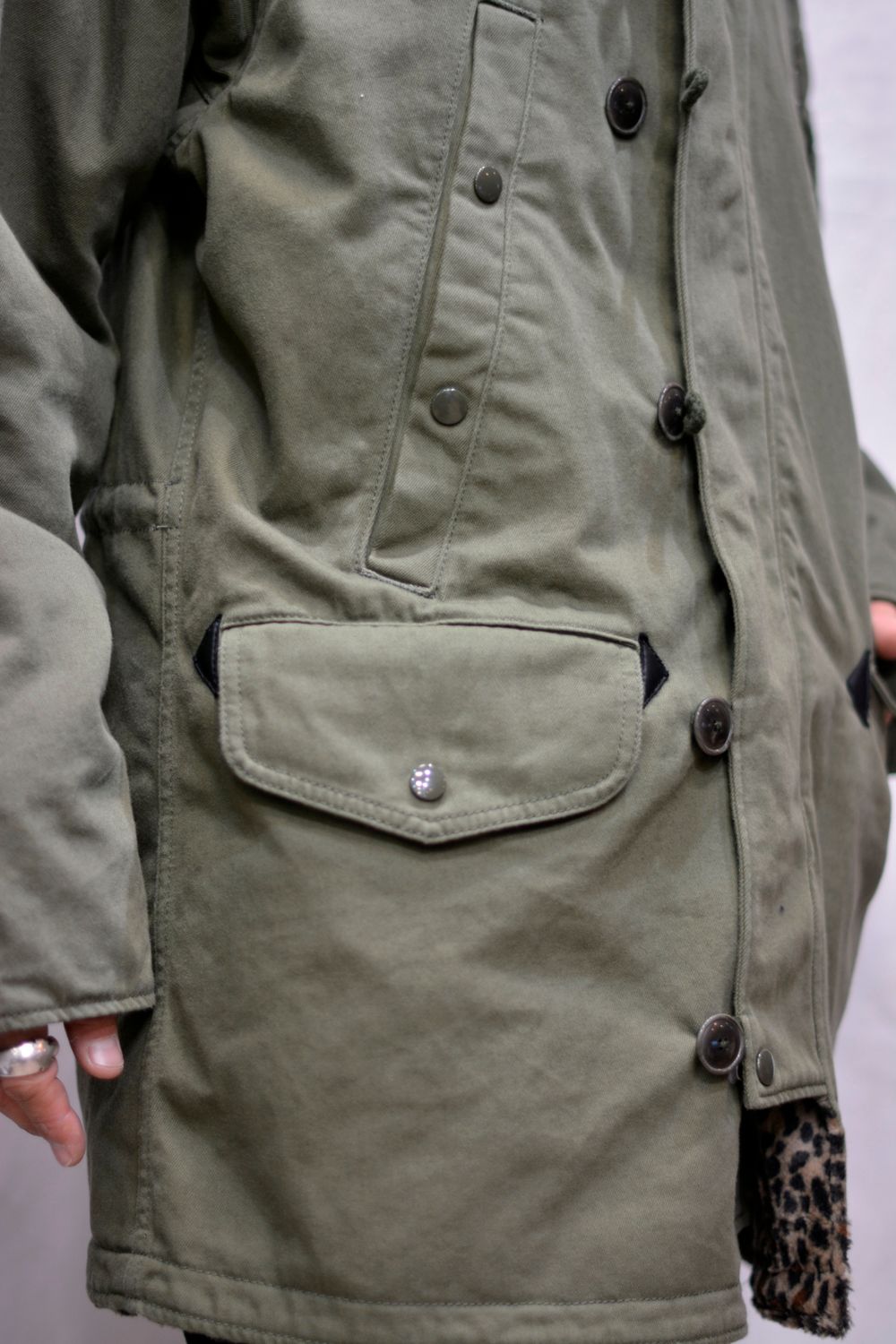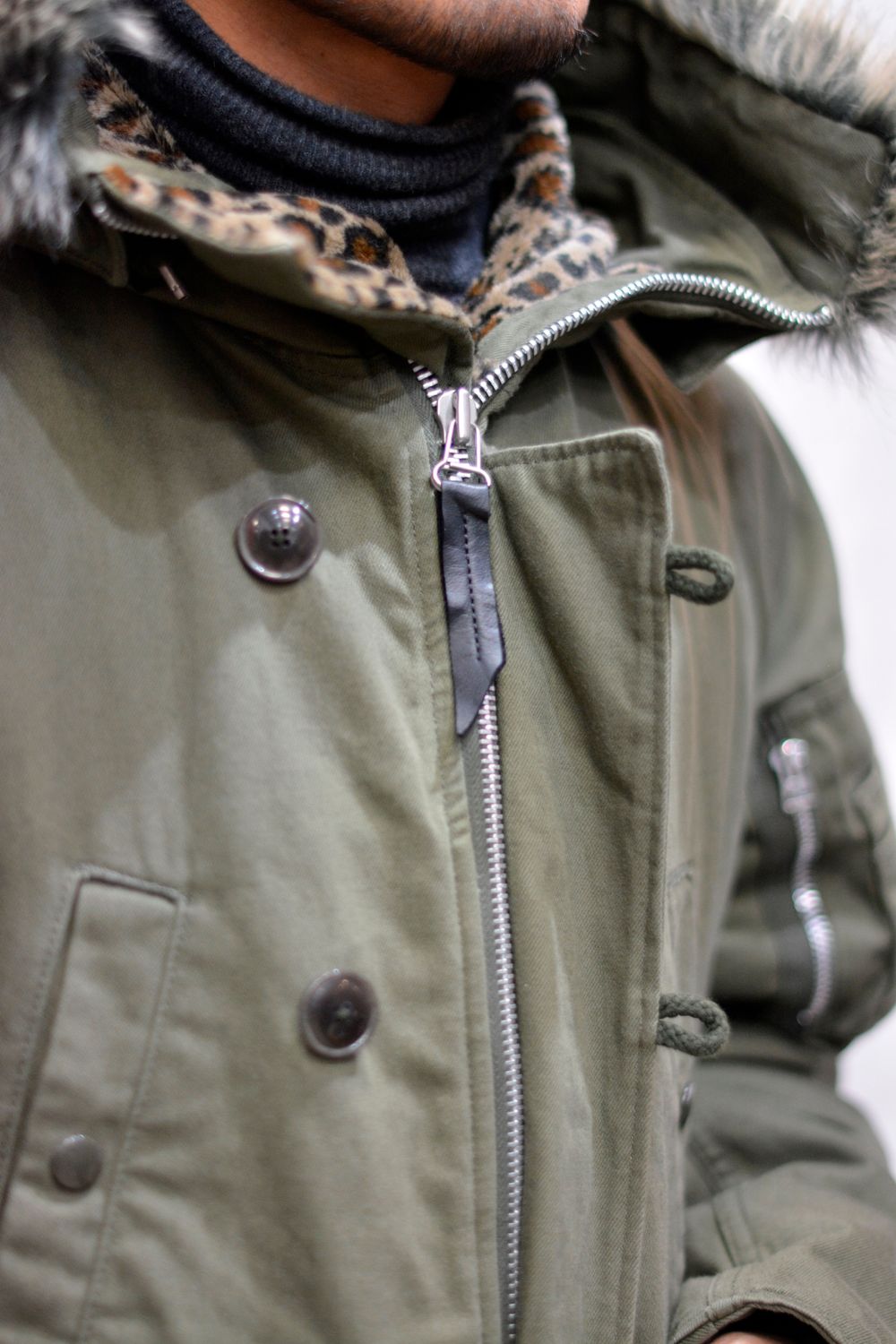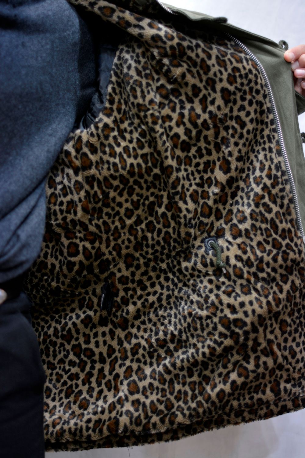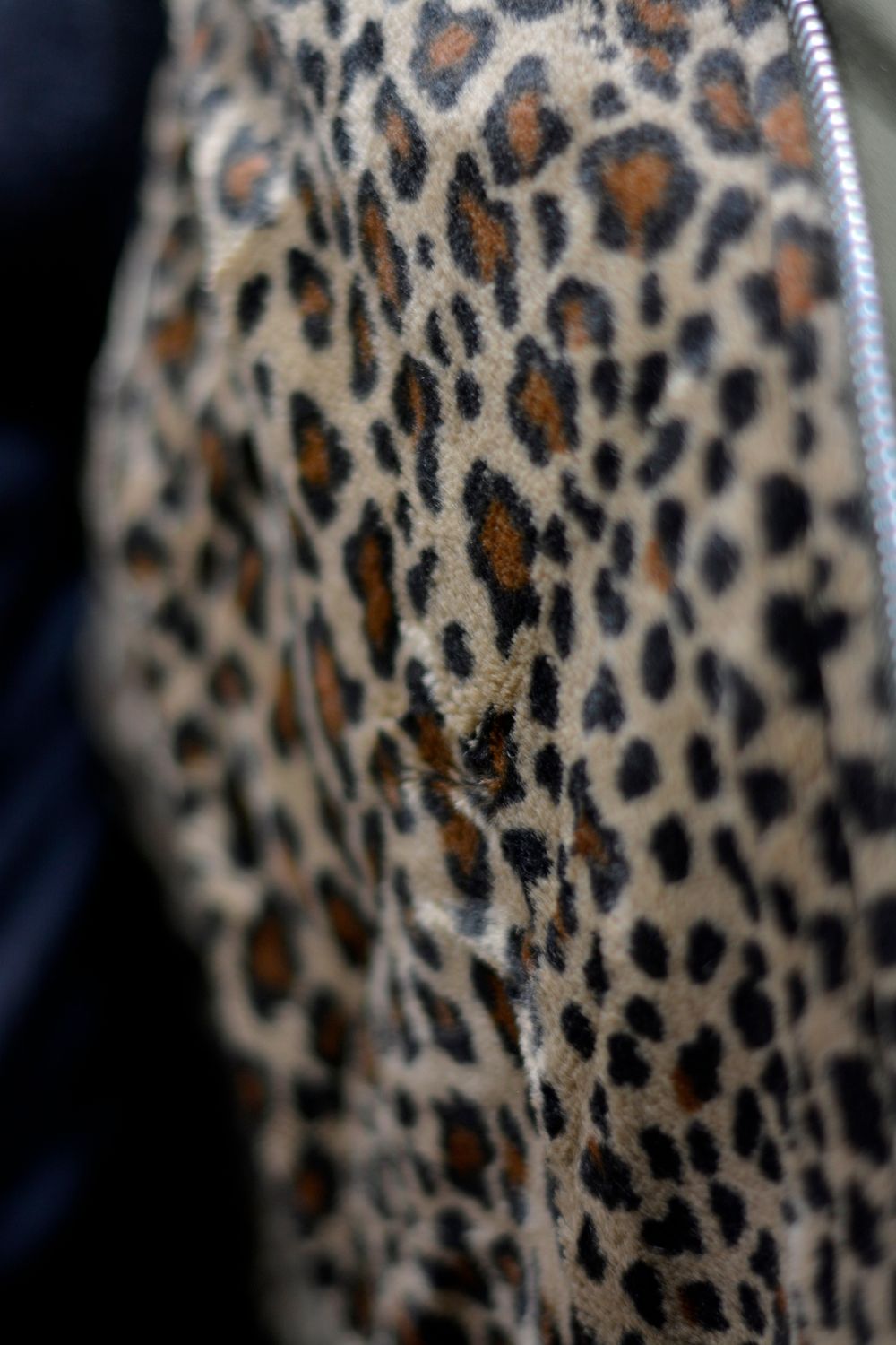 オリジナルレオパードプリントフェイクファーを裏地に採用、袖裏はキルティング。